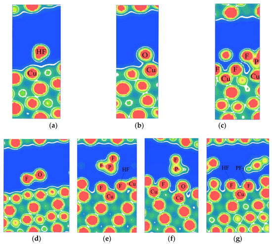 Figure 3 shows the electron density plots of HF, H2O, and PF5 adsorption on the stable configurations of the Cu(111) surface. As illustrated in Figure 3a,b,d, when HF, H2O, or both of them exist on the Cu(111) surface, there is no obvious overlapping of electron cloud between HF or H2O and the surface atoms of Cu(111), suggesting that no adsorption occurs for H2O or HF on the surface of copper. However, obvious overlapping of electron cloud could be observed between F atoms from HF and Cu atoms as PF5 and H2O exist simultaneously, as shown in Figure 3e. The similar results could be observed in Figure 3f, as H2O and PF5 coexist. Moreover, the electron contours of F atoms and Cu atoms are smooth and round, indicating that the ionic bond forms between the F atom and Cu atom. It proves that the adsorption of HF is chemisorption. Thus, it can be concluded that PF5 can promote the dissociation of HF and the physical adsorption of H2O on Cu(111) surface. Shu at el. [15] observed P, F, and O elements on the surface of Cu foil which was immersed in the electrolyte of lithium-ion batteries for 30 days and deduced that small amounts of decomposition product (such as PF5) during storage of lithium-ion batteries may have vital effects on the stability of copper. Additionally, some researchers deduced that small amounts of decomposition product (such as PF5) during storage of lithium-ion batteries may have vital effects on the stability of copper [6].
