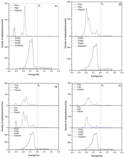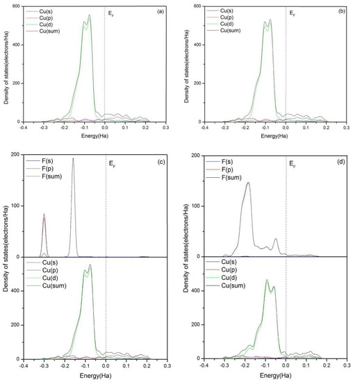 To obtain more information about the interaction between the adsorbates and the surface of Cu(111), the total and partial densities of states (DOS) of related F and Cu atoms are calculated as shown in Figure 4. The Fermi level (EF) is set as zero and used as a reference. From Figure 4a, the bonding peaks of clean Cu(111) are mainly located at the energy range between EF and −3 Ha. The bonding electrons between −0.2 and 0 Ha are mainly dominated by the valence electrons of Cu d orbit.