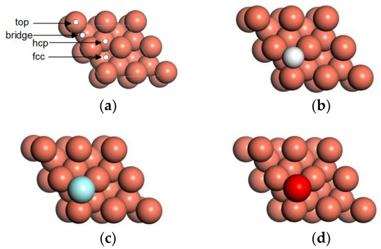 Stable adsorption configuration of adatom on Cu(111) surface: (a) surface adsorption sites of Cu(111), (b) H, (c) F, and (d) O.