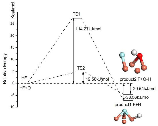 The adsorption energies and geometrical parameters of the HF molecule on clean and O preadsorbed Cu(111) surfaces are calculated to explain the reduction of the dissociation energy barrier. From Table 4, it can be seen that the adsorption energy of HF on O/Cu(111) surfaces is 0.52 eV, which is evidently higher than that on clean Cu(111) surfaces (i.e., 0.27 eV), showing that the adsorption of HF on O atom preadsorbed Cu (111) surfaces is more stable than that on clean Cu(111) surfaces. Moreover, the bond length of HF on Cu(111) surfaces with the preadsorbed O is 0.95 Å, which is longer than that on clean Cu(111) surfaces. Thus, it can be concluded that the preadsorbed O atom can promote the break of the H–F bond. Since O atom is more electronegative than F atom, it is apt to break the H–F bond. Thus, it also demonstrates that HF is prone to etching the copper oxides on the surface of copper, as reported in the reference [14,15].
