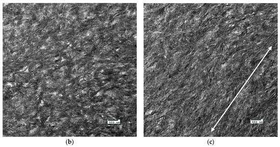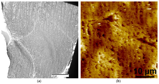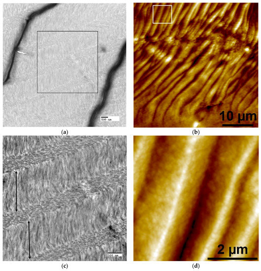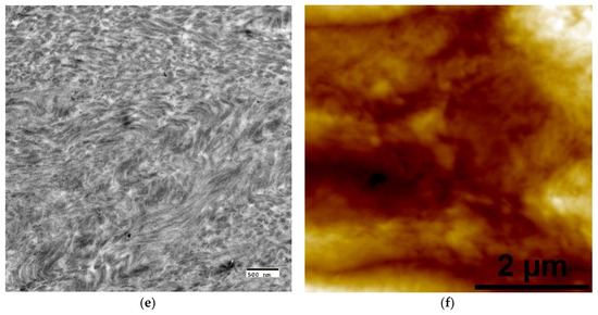 After the crosslinking reaction, non-mineralized LCC samples were embedded and sectioned for imaging via TEM and AFM to qualitatively examine the collagen organization (Figure 1). Cholesteric microstructures were present in all groups after the crosslinking treatment; X51 was chosen as a representative sample to demonstrate the cholesteric organization of collagen, which is best visualized in TEM when the collagen fibrils are oriented parallel/perpendicular to the image plane. Open arrows delineate dark wrinkles, artifacts of microtome sample preparation that make it difficult to visualize collagen organization at a relatively low magnification, even with staining to enhance contrast (Figure 1a), but the cholesteric ordering is readily seen at higher magnifications (Figure 1c,d). Therefore, complimentary AFM height images were found to be more useful for visualizing cholesteric collagen microstructures over longer distances (Figure 1b and Figure 3b). Lamellar features were present in all of the scaffolds, with layer thicknesses ranging from approximately 0.5 to 5 microns. The lamellar organization in these LCC scaffolds was not homogeneous; thin, disorganized boundaries existed between larger cholesteric domains though they still appeared to be comprised of fibrillar collagen (Figure 1e,f). The pitch and periodicity varied throughout the LCC matrix, presumably a function of collagen concentration, as previously reported [39]. It should be noted that inhomogeneity in cholesteric ordering was likely to be a direct result of geometric restrictions that are imposed by the shape of the dialysis cassette in this experiment. Although outside the primary focus of this paper, Supplementary Figure S1 was prepared to describe, in greater detail, the different collagen structures that were formed in this work. The terminology that was used in Figure S1 was directly adapted from the work of Mosser et al. [39]. Because the focus of the experiment was to develop a material that mimics both the mineralized fibril building block and the lamellar microstructures of bone, cholesteric regions were selectively chosen for further characterization.