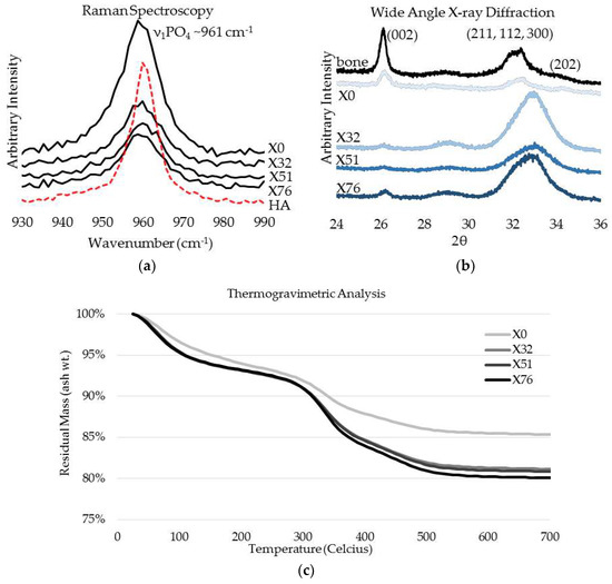 The OPN-directed PILP mineralization was terminated after 72 h to prevent possible precipitation, which would result in the subsequent formation of an extrafibrillar apatite surface coating. After mineralization, several characterization methods were used to examine the resulting mineral phase, the results of which are summarized in Figure 2. Raman spectroscopy was performed to compare the strongest phosphate vibrational mode (ν1PO4) of OPN-PILP mineralized collagen to that of commercial hydroxyapatite (Figure 2a). When compared to commercial crystalline hydroxyapatite, which has a sharp ν1PO4 symmetric peak centered about 961 cm−1, PILP-mineralized LCC films had broader, less intense, and less symmetric peaks that appeared to be centered at ~959 cm−1. The spectra followed a general trend of decreasing ν1PO4 Raman intensity with increasing crosslink density. This could be indicative of physical constraints, such as changes to intramolecular spacing due to increased crosslink density, which may restrict elongation and growth of PILP-generated mineral crystals. WAXD spectra were also collected from the OPN-PILP groups and when compared to spectra of native bovine bone the difference in peak ratios suggest that crosslinking may help to preserve the orientation of collagen fibrils (i.e., containing intrafibrillar mineral) near the surface of crosslinked LCC samples (Figure 2b) [41]. The uncrosslinked control scaffold (X0) had a WAXD spectra that most closely resembled mature bone apatite, with the strongest 2θ peak intensity coming from the (002) plane at 29°, followed by the overlapping peaks from the (211), (112), and (300) near 32°, and the (310) peak at 40°. Conversely, the three crosslinked groups had spectra that were similar to less crystalline, or amorphous, apatite mineral, with a broad 2θ peak around 30° to 35°, consistent with the advancement of apatite crystallization in developing rat calvaria [42]. TGA (n = 1) was used to estimate the amount of mineral in each scaffold by measuring the residual ash weight after water loss (~200 °C) and the combustion of organic constituents at ~600 °C. The inorganic ash weight measurements at 600 °C were approximately 85%, 81%, 81%, and 80%, for the experimental groups X0, X32, X51, and X76, respectively (Figure 2c).