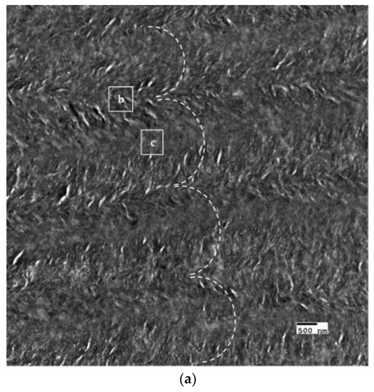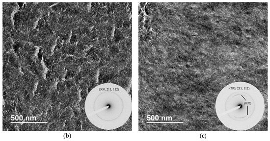 The crosslinked scaffolds appeared to be heavily mineralized when viewed in bright field TEM and AFM (Figure 3, Figure 4 and Figure 5). The collagen matrices served as a template for mineralization during the PILP process, the resulting mineral provided adequate contrast to reveal the underlying cholesteric microstructures, which were still present in all groups. Continuous spherical lamellar domains spanned tens of microns with thin, less-organized domain “boundaries” (Figure 3). These regions resemble mineralized versions the “interconnected spherulitic”, “loose cholesteric”, and “dense cholesteric” phases, as characterized by Mosser et al. using a combination of TEM and PLM to visualize dense collagen matrices reconstituted in vitro [39]. The herringbone pattern shown in Figure 4a is a classic cholesteric pattern shown previously in a variety of natural materials and described in exquisite detail by Bouligand [3]. To help interpret the image, and to confirm the intrafibrillar mineralization of collagen fibrils, electron diffraction patterns were obtained from the regions marked ‘b’ and ‘c’ in Figure 4a. The absence of the (002) reflection in the diffraction pattern from region ‘b’ indicates that the crystallographic c-axes (e.g., the collagen fibril axes) are oriented nearly perpendicular to the image plane, while the presence of the (002) in the region ‘c’ diffraction pattern shows that the collagen fibrils lie in the plane. Notably, the two regions marked ‘b’ and ‘c’ in Figure 5 correlate nicely with the relatively recently characterized “lacy/nested/acicular” and “filamentous” nanoscale mineral patterns that were observed in compact lamellar bone [43,44].