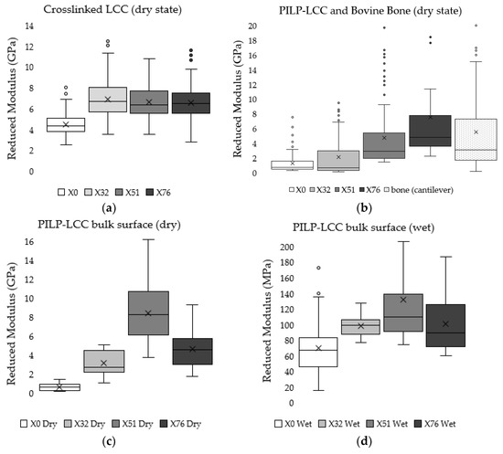Tukey box-and-whisker plots of indentation moduli help to view the distribution of data from two separate c-bAFM nanoindentation experiments. The box ends represent the upper and lower quartiles, the median is marked by the horizontal line inside the box, the mean is marked by the X, and potential outliers are shown as circles located outside of the whiskers. For a more detailed description of the box-and–whisker plot construction, please see the methods. (a) Non-mineralized crosslinked LCC semi-thin cross section tested in the dry state; (b) PILP mineralized crosslinked LCC semi-thin cross section compared with native bovine bone; (c) Bulk PILP-LCC sample surface measured in the dry state; and, (d) Bulk PILP-LCC sample surface measured in liquid after re-hydrating in 1X PBS.