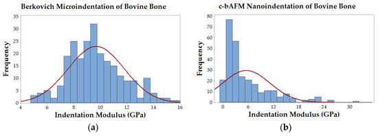 Histograms of modulus data from native bovine bone comparing Berkovich-style microindentation and c-bAFM nanoindentation techniques. (a) Berkovich-style microindentation data followed a normal distribution with a mean indentation modulus of 9.7 ± 2.2 GPa; and, (b) Cantilever-based AFM nanoindentation data had a right-skewed distribution with a mean indentation modulus of 5.5 ± 5.6 GPa.