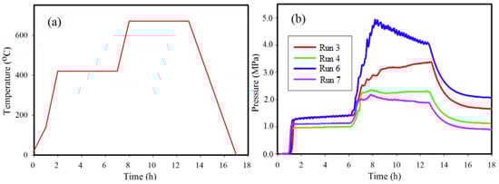 Figure 2a illustrates the typical heating profile used for Runs 3, 4, 6, and 7 and is the general format for all other reactions not listed in Table 1. The pressure profiles for some reactions listed in Table 1 are shown in Figure 2b. The maximum pressure achieved during a reaction depends on the quantity of reactants, in particular of NaBH4, used in the reactor [25]. For all reactions, pressure increases to a maximum value (Pmax) ranging between 2.3 MPa and 4.9 MPa at 670 °C. A rapid increase in pressure occurs as the thermocouple records a ramp from ~140 °C to 425 °C and also from 425 °C to 670 °C. The fluctuations in pressure profiles shown in Figure 2 are points in the reaction at which phase transformations are rapidly occurring as noted in earlier work [26,29]. Similar pressure profiles are observed for all other reactions listed in Table 1.