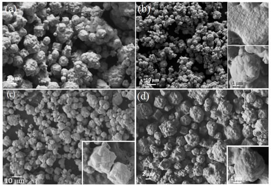 The morphology of Ni-B powders obtained from Run 3, Run 4, Run 6, and Run 8 are shown in Figure 4. The product is comprised of large aggregates with a broad distribution of many smaller particles. The Ni-B powders obtained at 670 °C are large aggregates consisting of well-defined, inter-penetrating polygonal particles with orthogonal morphology. In all samples produced by these syntheses, two different morphologies of aggregates are common; each of a size ranging from 2 μm up to 10 μm. These two morphologies are orthogonal or rectangular shaped and spherical shapes as shown in the insets of Figure 4c,d. Each aggregate morphology shows smooth surfaces with individual particles of size varying from 50 nm up to several hundred nm in size.
