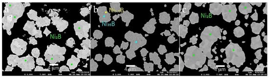 Quantitative elemental analyses are performed using a JEOL JXA 8530F field emission electron microprobe analyzer (EPMA, JEOL (Australasia) Pty Ltd., French’s Forest, Australia) equipped with five wavelength-dispersive spectrometers and using Probe for EPMA software [25]. For these analyses, powder samples are mixed with conductive resin and placed in a 30 mm diameter mold inside a hot mounting press. The sample mount is polished with a series of diamond pads and cloths to a mirror finish suited to electron microprobe analysis. Spot analyses on borides are performed using the following combined conditions: B Kα X-ray intensities are measured at 7 kV accelerating voltage, followed immediately by intensity measurement of the Ni Kα X-ray line at 15 kV accelerating voltage. A focused beam is utilized and the beam current maintained at 40 nA under both conditions. Details on data collection methods, analyzing crystals, standard materials, and data reduction for EPMA analyses are provided in Shahbazi et al. [25].