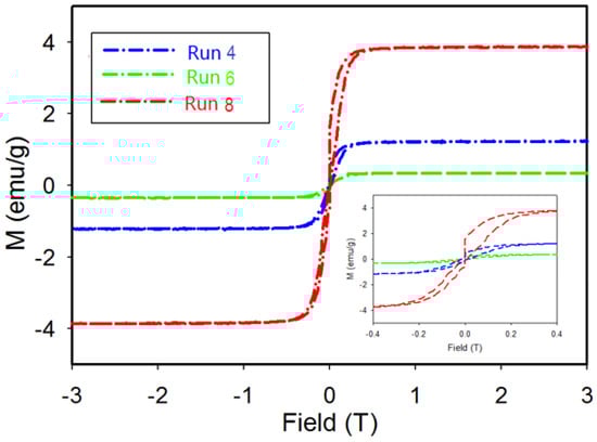 EPMA results for the sample from Run 4 show that areas with a nickel rich core are present and are identified in Figure 7b. The inclusion of nickel-rich phases (such as Ni35.1B or Ni) may result in a minor hysteresis effect in magnetic measurements. Magnetic measurement of the product from Run 8 with a dominant Ni3B phase and 10% Ni—as indicated by XRD results—reveals a larger hysteresis loop due to the higher amount of Ni present. The lower value of magnetization for the product from Run 4 is consistent with the known weak paramagnetic behavior of Ni2B [33]. The magnetization measurement for Run 6 displays low magnetization values along with an increase in magnetization at a low magnetic field and then saturation at an applied field of 0.2 T. Unlike the other two samples, hysteresis is not observed for this sample from Run 6. In this case, the absence of Ni or Ni-rich particles is consistent with the observed hysteresis behavior of the sample.