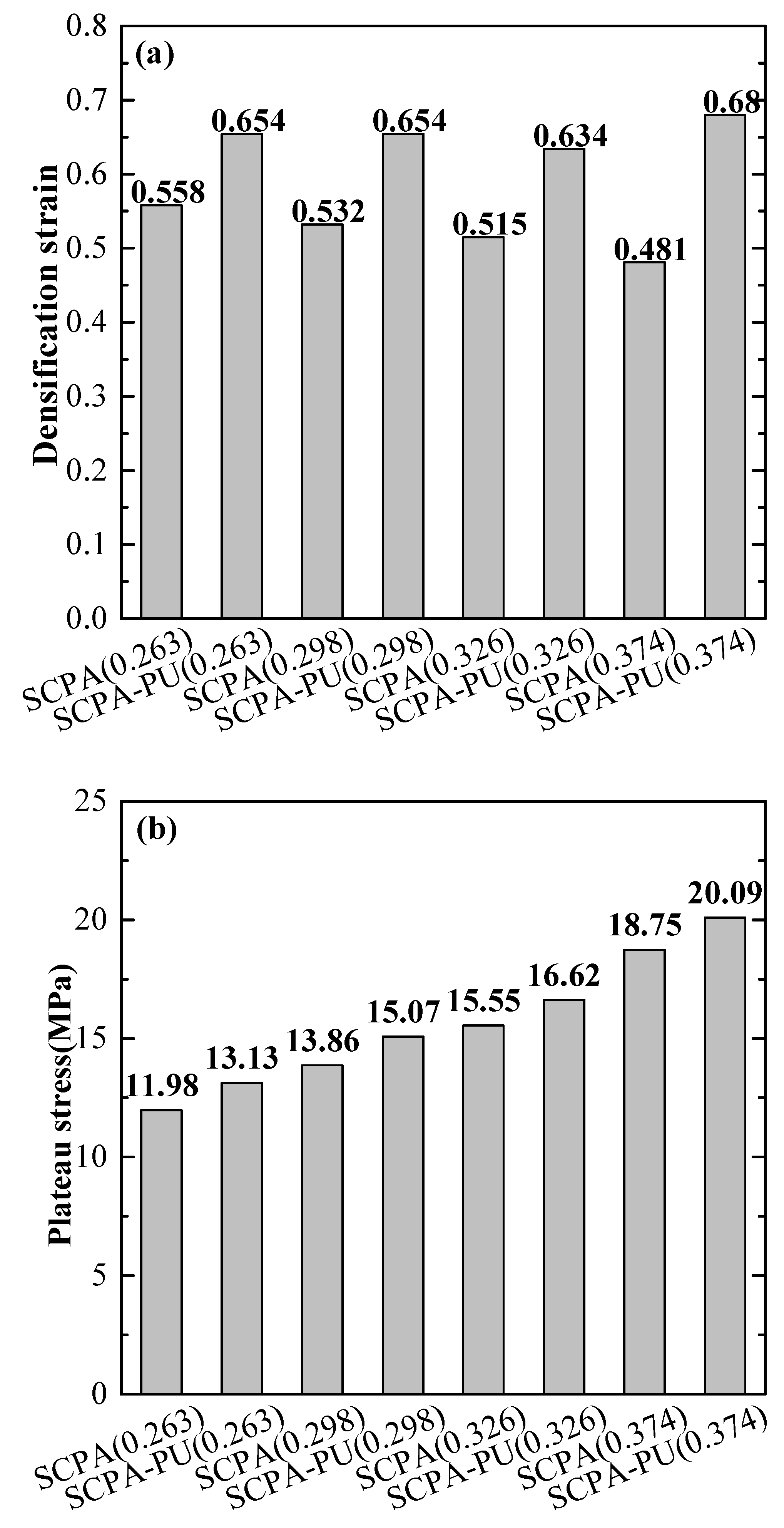 - The energy absorption capacity of SCPA-PU composites is superior to that of the SCPA. The densification strain energy of the SCPA-PU composites, with the relative density values of 0.263, 0.298, 0.326, and 0.374, is 28.59%, 33.65%, 31.59%, and 51.55% higher than those of the SCPA, with the same relative density value, respectively. Besides, the weak dependence of the densification strain of the SCPA-PU composites on the relative density is seen, while the plateau stress and the densification strain energy increase as the relative density increases. Furthermore, the ideal energy absorption efficiency (I)-strain curves of SCPA-PU composites and SCPA consist of three parts: Fast ascending branch, plateau stage, and descending region. The plateau I value of SCPA-PU composites is close to that of SCPA, while it has a wider plateau strain range. It is also found that the plateau I value of SCPA-PU composites is insensitive to the relative density of the SCPA.