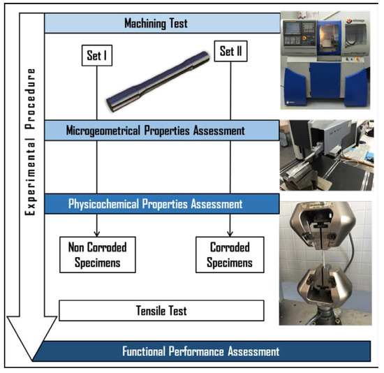 Blocks of 32 specimens—divided in two equal sets of 16 pieces—were dry machined for this study. Workpieces for Set I were only dry turned before being tensile tested, while samples for Set II were exposed to corrosion after being dry turned and before being tensile tested.