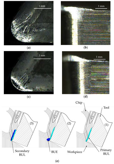 Comparison of built-up layer (BUL) and built-up edge (BUE) for different cases. (a,b) Vc = 100 m/min, f = 0.2 mm/r. (c,d) Vc = 40 m/min, f = 0.05 mm/r. (e) Scheme of the BUL and BUE formation.