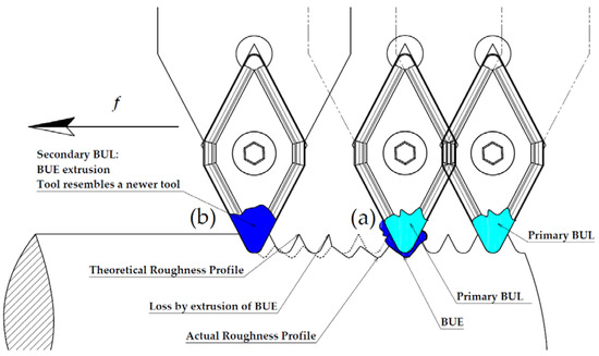 From geometric considerations, Ra depends directly on f and the edge position angle of the tool for horizontal turning processes [1,9]. The BUE development diminished this angle and, consequently, the height of the peaks in the profile reduced and smoothened, thereby decreasing Ra (Figure 5a). This shows that the effect of the tool wear seems to be responsible for a decrease in Ra in certain sets of parameters. Secondary adhesion is a dynamic process, that is to say, the morphology of the tool can change at any time (Figure 5a). In this sense, when BUE was extruded, the height of peaks increased and so did Ra (Figure 5b) [1,9].