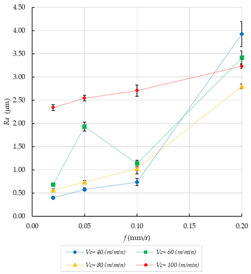 According to this, the extreme value of Ra found in (Vc, f) = (60, 0.05) can be explained (Figure 6). On the other hand, despite dry turning significantly shortening the tool life, it may have a positive effect on the microgeometrical properties of the specimen, at least in a controlled length of machining [23]. In fact, surface integrity got worse as feed increased for every tested cutting speed, as expected (Figure 6). These results are in good agreement with previous studies [19,24].