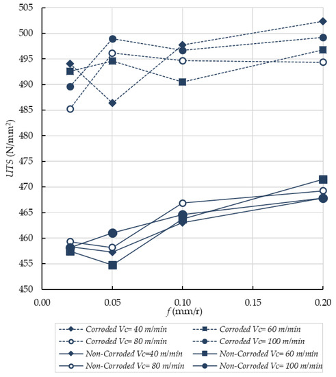 - Generally speaking, the UTS increases with the feed. Thus, there is no predominant influence of the microgeometrical properties acquired after machining over the UTS. In this sense, tensile residual stress taking place on the surface after machining is not large enough to generate a decrease of UTS value.