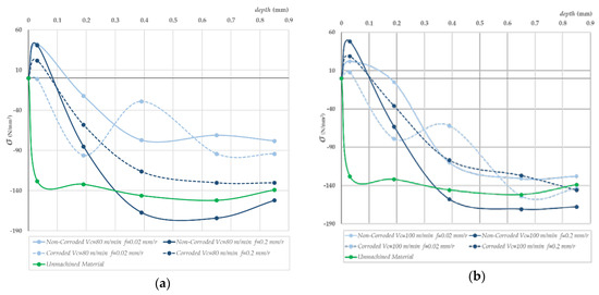 Evolution of axial residual stress/depth after machining for the cutting parameters indicated in noncorroded and corroded specimens. (a) Vc = 80 mm/min, (b) Vc = 100 mm/min. Two feed rates shown in both cases, f = 0.02 mm/r and f = 0.2 mm/r.