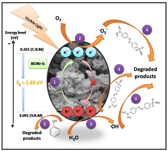 - Gao, M.; Zhang, D.; Pu, X.; Li, H.; Lv, D.; Zhang, B.; Shao, X. Facile hydrothermal synthesis of Bi/BiOBr composites with enhanced visible-light photocatalytic activities for the degradation of rhodamine B. Sep. Purif. Technol. 2015, 154, 211–216. [Google Scholar] [CrossRef]