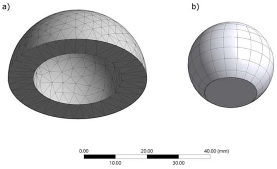 The finite element model is shown in Figure 2. A convergence study was performed to determine the optimum mesh aspect; contact pressure and cup deformation were used as performance metrics. For the cup the tetra patch conforming and tetra patch independent, the hex dominant quadrilateral/triangular and all quadrilateral, multizone hexagonal were compared; for the head, quadrilateral and triangular elements were compared. Regarding the head, quadratic elements were selected, for the cup a multizone hexagonal/prismatic hexagonal dominant meshing was chosen. The meshing of the entire model generated a total of 2012 elements and 3283 nodes, having 383 contact elements (Conta174 for the cup and Targe170 for the head). Elements of the mesh, having a minimum edge length of 53.7 mm, presented an average quality of 0.759 ± 0.152 and an average aspect ratio of 2.144.