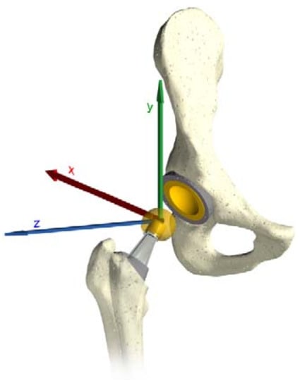 The simulations were performed comparing the effect of different clearances ranging from zero to 0.5 mm, namely 0, 0.05, 0.25 and 0.5 mm. The comparisons were in terms of magnitude and distribution of the contact pressure and of the deformation at the interface. As the sliding surfaces play a key role in the tribological performance of hip implants, the presence of the frictional force was considered. The coefficient of friction was obtained from experimental activities [32,33], considering a dry contact, and corresponded to 0.13. Even though the surface roughness could influence the friction and wear of a joint [34,35], the ease of computation and the very fine roughness—typical of actual hip replacements—led to a discharge of this aspect in the study. Contact area, pressure, and deformation were computed as a function of the angular displacements and dynamic loading calculated through a musculoskeletal model. Force components and orientations will be defined with respect to a pelvic reference frame that coincides with the true anatomic superior, anterior, and lateral directions.