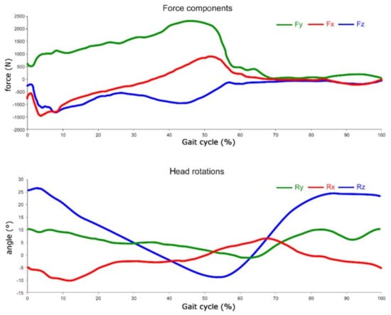 The force components and rotations, obtained from the multibody analysis, are shown in Figure 4, plotted along the gait cycle percentage.