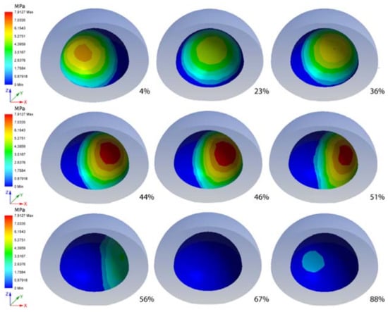 In Figure 5, pressure distribution, on the sliding surface of the acetabular cup during different steps are shown. Along with the cycle progressing, it is possible to observe the distributions of pressure and its magnitude. The rotation of the head (suppressed in the images for a better understanding) varies with the position of the highest value of pressure. When the pressure reaches its maximum values along the cycle, its major magnitude is in the edge zone of the cup.