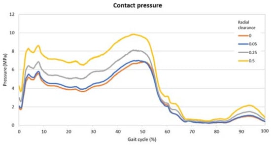Table 2 presents the highest values along the gait cycle found for pressure and deformation, comparing the radial clearances. These values were all located around the middle of the gait cycle, i.e., nearly 50%.