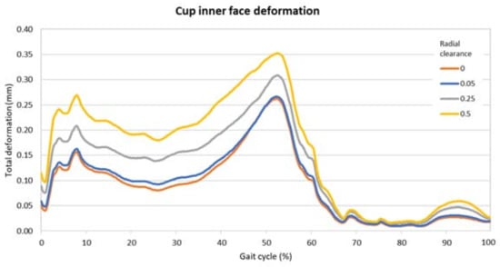 Maximum values of the deformation on the inner surface of the acetabular cup for different radial clearances.