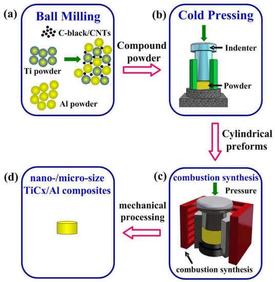 - Wang, L.; Qiu, F.; Shu, S.L.; Zhao, Q.L.; Jiang, Q.C. Effects of different carbon sources on the compressive properties of in situ high-volumefraction TiCx/2009Al composites. Powder Metall. 2016, 59, 370–375. [Google Scholar] [CrossRef]