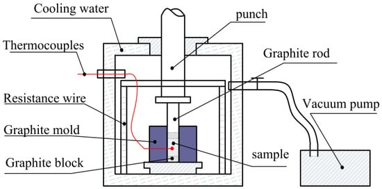 Figure 1 shows the process flow chart of nano-/micro-size TiC/Al composites. The materials were mixed sufficiently with low-speed ball milling (24 h, 50 rpm approximately) and cold pressed into cylindrical samples (diameter of 45 mm and length of 35 mm) afterwards. After the milling, the real oxygen contents in mixed powder were analyzed by the pulse heating inert gas fusion–infrared thermal conductivity method, and the oxygen impurity is 0.2–0.3 at. %. The cylindrical sample was put into a vacuum thermal explosion furnace (Shenyang jinyan new material preparation technology Co. Ltd., Shenyang, Liaoning, China), Detailed schematic is shown in Figure 2) with the heating rate of about 30 K/min and the temperatures were measured by W5-Re26 thermocouples (Shenyang Dongda Sensor Technology Co. Ltd., Shenyang, Liaoning, China). The sudden rapid rise in temperature was the sign of that the sample had been ignited. The sample was quickly pressed on while its temperature is still high and then cooled down to the room temperature. A small amount of the mixed Al-Ti-C powder was performed for differential thermal analysis (DTA, TA SDT-Q600, New Castle, DE, USA) experiment to research the effects of different carbon sources on the reaction process of Al-Ti-C system. The sample was heated to 1273 K in an alumina crucible with a heating rate of 30 K/min.