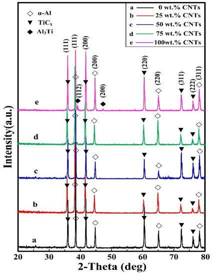 Figure 3 shows the XRD patterns of the 30 vol. % TiC/Al composites synthesized by Al-Ti-C with different CNT contents as the carbon source. It shows that the final products mainly include α-Al and TiC. In addition, a small amount of Al3Ti intermetallic compound was inspected in the composite that was synthesized by Al-Ti-C with 100 wt. % CNTs as the carbon source. It indicated that, when the CNTs content in the Al-Ti-C system was high, the reaction of the system tended to be incomplete.