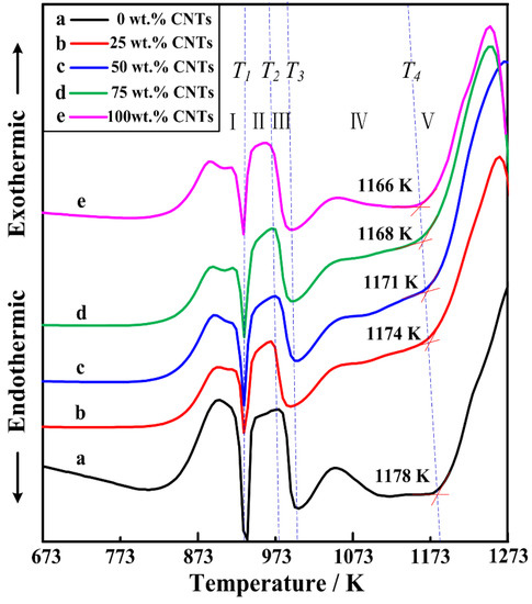 On behalf of developing a better comprehend of reaction process in the Al-Ti-C/CNTs systems, DTA experiments were employed in the Al-Ti-C/CNTs mixtures. Figure 4 is the DTA curves collection for the Al-Ti-C powders with different CNT contents as the carbon source. These DTA curves show similar thermodynamic behaviors, which indicated the influence of carbon sources on the reaction process of the Al-Ti-C system. On the basis of the results, the mechanism of the reaction is a model of reaction-dissolution-precipitation. With the increase of the temperature, aluminum melted at temperature T1, subsequently, Al3Ti was first generated in the Al-Ti-C system and then melted to form a binary Al-Ti liquid phase at temperature T2. Simultaneously, the binary Al-Ti liquid phase spread over the C, subsequently led to the formation of ternary Al-Ti-C liquid phase at temperature T3. When the concentration of C and Ti were high enough, TiC was generated and precipitated out of the melts. An obvious exothermic peak started from T3, and continued to ~1073 K. It indicated that the formation of ternary Al-Ti-C liquid phase and a small quantity of TiC promoted the exothermic event. With the increase of the temperature, it indicated that the exothermic event at temperature T4 was caused by the formation of a large number of TiC. With the increase of the content of CNTs in the Al-Ti-C system, the TiC generating temperature (T4) decreased from 1178 to 1166 K.