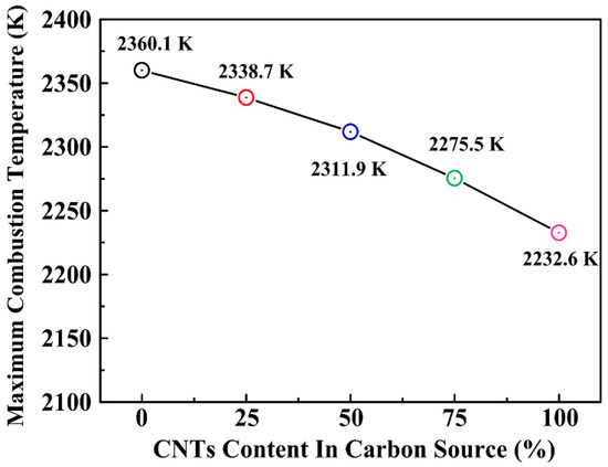 Variation of the maximum combustion temperature in the Al-Ti-C system with different CNT contents as the carbon source.