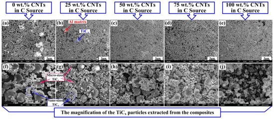 The Field Emission SEM (FESEM) images of the 30 vol. % TiC/Al composites synthesized by Al-Ti-C system with different CNT contents as the carbon source, (a) 0, (b) 25, (c) 50, (d) 75, and (e) 100 wt. %, respectively, figures (f–j) are the magnification of the TiC particles extracted from the composites corresponding to the figures (a–e), respectively.