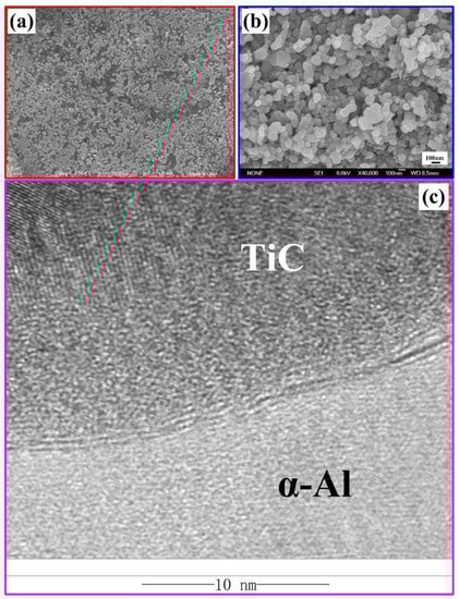 (a) The SEM images of the 30 vol. % TiC/Al composites synthesized by Al-Ti-C system with 50 wt. % CNT as the carbon source, (b) the magnification of the TiC particles extracted from the composites synthesized by Al-Ti-C system with 100 wt. % CNT as the carbon source, and (c) High Resolution Transmission Electron Microscope image of interface between α-Al and nano-sized TiC in 30 vol. % TiC/Al composites synthesized by Al-Ti-C system with 50 wt. % CNT as the carbon source.