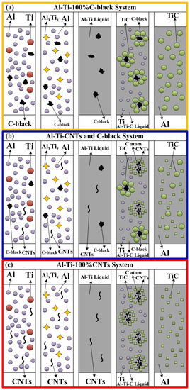 Schematic diagram showing the above-mentioned formation process of TiC particles in the Al-Ti-C system with different CNT contents as the carbon source: (a) Al-Ti-100%C-black system, (b) Al-Ti-CNTs and C-black system, and (c) Al-Ti-100%CNTs system.