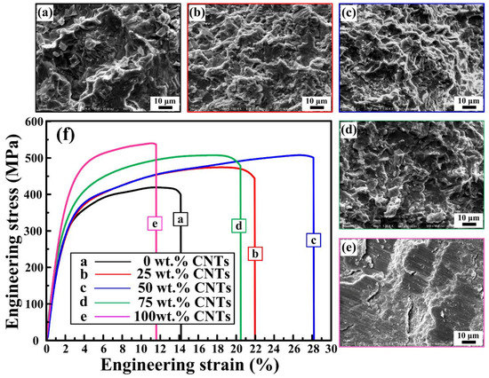 Figure 9 are the SEM images of the compression fracture surfaces and compressive stress-strain curves of the 30 vol. % TiC/Al composites that were synthesized by Al-Ti-C system with different CNT contents as the carbon source. Figure 9f shows compressive stress-strain curves of them. The compressive properties of the composites are enumerated in Table 3. Figure 10 is the comparisons in compressive yield strength vs. engineering strain and ultimate compressive strength vs. engineering strain of them. On the elastic part of the compression curve, the difference in elastic modulus is not obvious, and the compression curves of the elastic part are basically overlapping, with some minor differences. The reason for this phenomenon is that as the content of CNTs increases, the number of nano-ceramic particles increases greatly, the size decreases remarkably, resulting in a large increase in the interfaces between the ceramic particles and the matrix, and the interface bonding is excellent, as shown in Figure 7c, therefore, the modulus of elasticity has increased slightly. The yield strength (σ0.2), ultimate compressive strength (σUCS), and fracture strain (εf) of TiC/Al composites are enhanced with the CNT contents changing from 0 to 50 wt. % in the system. With the CNT contents changing from 50 to 100 wt. %, the σ0.2 and σUCS of TiC/Al composites further increase, while εf reduces gradually. Among all of the composites, the one synthesized by Al-Ti-C with 100 wt. % CNTs as the carbon source possesses the σ0.2 and σUCS of 417.5 MPa and 538.3 MPa, while the εf of 11.4%, which is the lowest one. The composite synthesized by Al-Ti-C with 50 wt. % CNTs is optimized to have the best comprehensive properties: the σUCS of 505.6 MPa and the εf of 28.3%. Al-Ti-C with different CNT contents as the carbon source.