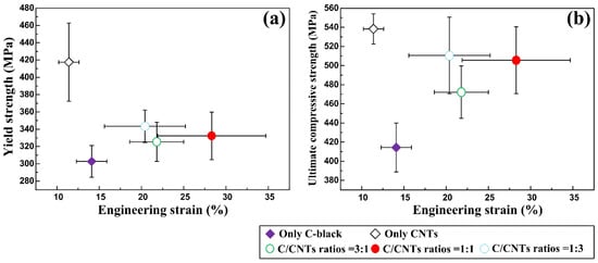 The comparisons in (a) compressive yield strength vs. engineering strain and (b) ultimate compressive strength vs. engineering strain of the 30 vol. % TiC/Al composites that were synthesized by Al-Ti-C with different CNT contents as the carbon source.