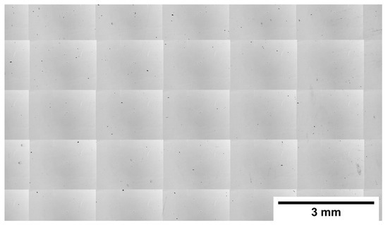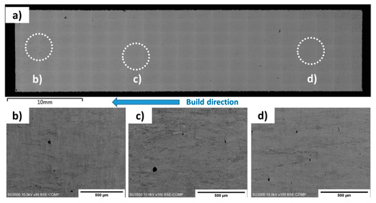 A mosaic stitched from optical micrographs of the X-Z cross-section of a cubic sample in the as-built condition taken from its polished state is shown in Figure 1. As depicted, crack-free specimens with optical density of 99.76 ± 0.11 were obtained. The remaining porosity, with irregular and spherical morphology, is homogeneously distributed within the sample and attributed to lack of fusion and gas entrapment.