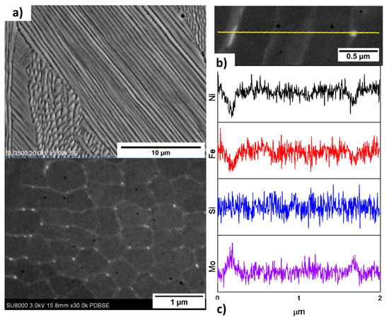 Figure 4c displays the EDS line scan spectra crossing from left to right, a precipitate at a cell boundary, three complete cells and their boundaries, and a precipitate lying on the last boundary. Ni and Fe, which are γ matrix elements, are distinctly depleted on the precipitate. On the other hand, the presence of Mo on the same regions causes a distinguishable high-count region on the spectrum, evidencing the fact that these are Mo-enriched precipitates. Furthermore, Si, which is another element that has been suggested to segregate, appears to have no clear concentration gradient throughout the scan.