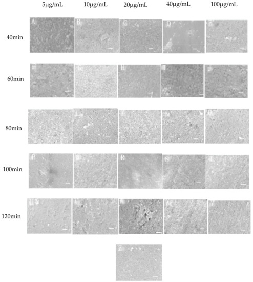 Scanning Electron Microscope (SEM) images of the coupons (10 K). (A–Y were respectively at different concentration and time; Z was the original metal; Scale bars in all photos represent 5 μm).