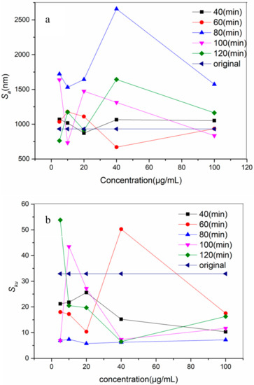 The samples were further observed using AFM to obtain the roughness data of the metals from the AFM images. The roughness of the original metal was Sa = 931 nm, Sku = 32.9, and the roughness of the modified coupons was demonstrated in Figure 3. It showed that at different times and concentrations, Sa and Sku were variable, while those of the original metal was constant. It confirmed the result of the SEM that there was some difference between the original metal and the modified ones in Sa and Sku. When the metals were incubated for 80 min, the surfaces turned the coarsest, independent of the concentrations (Figure 3). It also showed that with the increase of the concentration, the roughness of the surface was different. When it was 10 μg/mL, the value of the roughness was the lowest, then it went up again till 40 μg/mL, the value of the roughness was the highest. Comparing with the original metal, all the modified surfaces had a higher roughness. As we know, Sku shows the height distribution kurtosis of the surface, and it is better when the value of Sku is close to three. From Figure 3 we can see that, at 80 min all the values of Sku were closer to three (Figure 3b). thus 80 min was the most suitable incubating time. We can bring out from above data that the surfaces of the metal were different from the original one, and these differences were most distinct at 80 min, with concentrations of 10 μg/mL and 40 μg/mL. Therefore these two concentrations deserve extra attention.