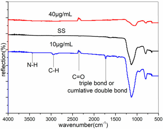 Fourier-Transform Infrared Spectroscopy (FTIR) of the original stainless steel and the stainless steel of 80 min, with concentrations of 10 μg/mL and 40 μg/mL. SS was the FTIR of the original stainless steel.