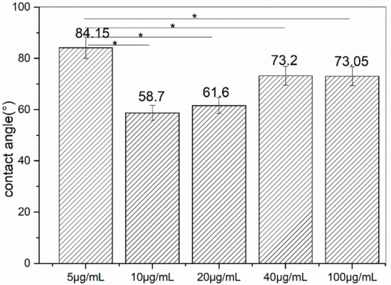 At 80 min, a concentration of 5 μg/mL of the value of CA was almost the same as the original metal (Figure 5), while at other concentrations, the values were smaller. At a concentration of 10 μg/mL, at 80 min, this difference became the greatest. This confirmed that under these circumstances the peptide interacted with the metal more successfully and stably, and thus the properties of the surface were distinctly changed. The organics binding to the surface should be the reason the changes occurred on the surface.