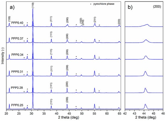 Analyzing the XRD patterns in Figure 1, the changes in the shape of the (200) line of the perovskite phase with the increase in content of PbTiO3 in the PMN–PT component of the PMN–PT–PS solid solutions can be seen. Starting from x = 0.28 (for the PMN–PT rhombohedral phase), the pattern of (220) has a single maximum (R3m space group exists) and for x = 0.40 (PMN–PT from tetragonal phase), the (200) maximum consists of two parts (originating from the Pm and P4mm space groups). In the case of the PMN–PT from the MPB area (for x = 0.34), the small reflections can be divided into more components (coexistence of R3m, Cm, Pm, and P4mm space groups) characteristic for monoclinic phases [11,22]. The changed shape of the diffraction (200) peak with the increase PT is presented in Figure 1b. From the selected enlarged region, it is seen that the (200) peaks become flattened and broad. The XRD tests also reveal that the influence of the PS component in PMN–PT–PS solid solutions is imperceptible, in comparison with Ref. [11]; however, an increased amount of the pyrochlore phase is observed.