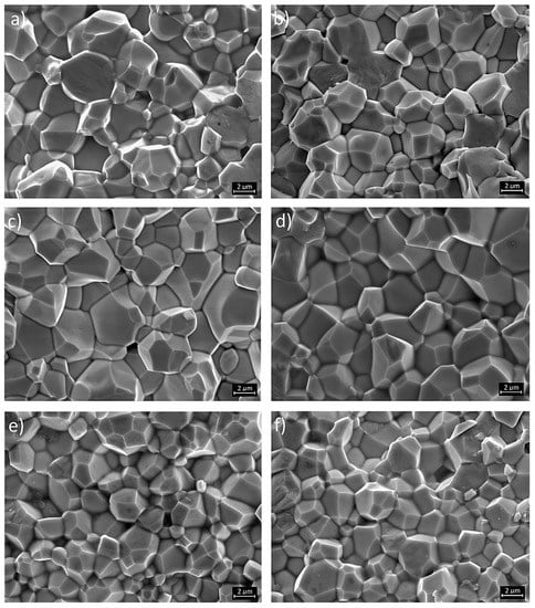 SEM images of PMN–PT–PS solid solutions: (a) PPP0.25; (b) PPP0.28; (c) PPP0.31; (d) PPP0.34; (e) PPP0.37; and (f) PPP0.40.