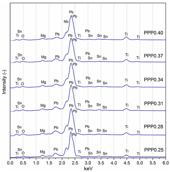 Homogeneity studies on the composition of solid solutions of PMN–PT–PS were carried out using the EDS tests (Figure 3). The EDS measurements (based on point and surface analysis) confirmed the qualitative composition of the obtained samples without the presence of foreign elements. In Table 2, the percentage of the individual components of the PMN–PT–PS compositions are presented. In the graph, the increase of the amount of lead and titanium in the PMN–PT–PS composition manifests in the increase of intensities of the respective peaks. In the case of all of the samples, lead, magnesium, and tin deficiency and a small titanium and niobium excess are observed, as compared with theoretical calculations. All of the presented deviations from the initial composition are within the acceptable range.