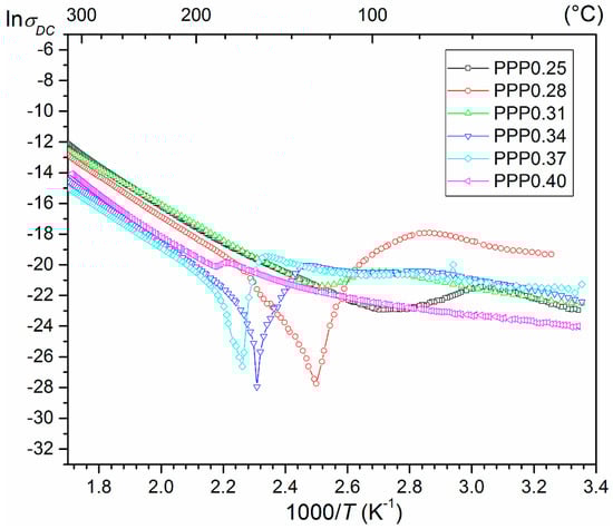 At room temperature, the ρDC resistivity of the PPP ceramic samples is in the range from 1.2 × 109 Ωm to 1.2 × 109 Ωm. The temperature dependencies of lnσDC(T) for the investigated PPP compositions are presented in Figure 4. For all of the compositions (excluding PPP0.40), just below the phase transition temperature, a sharp decrease of electrical conductivity is observed, and there is a maximum above the phase transition temperature (PTCR i.e., the effect of the positive temperature coefficient of resistivity). The minima of lnσDC(T) are the most visible for compositions PPP0.28, PPP0.34, and PPP0.37. Due to its creation at high temperature, both the defects as well as vacancies, and significant differences in conductivity at lower and high temperatures are observed. As the temperature rises, the reduction of grain boundary resistance causes a reduction of the mobility barrier of load carriers participating in the grain boundary conductivity.