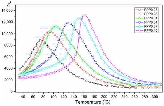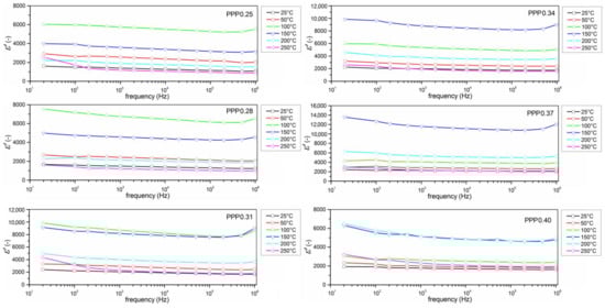 Figure 6 shows the frequency dependence of the real part of dielectric permittivity ε’ of the PPP samples, measured in temperature range from 25 °C to 250 °C. Figure 6a–f shows that all of the ceramic samples have a similar dielectric behavior, depending on the frequency of the measuring field, and they all have a Debye-like relaxation. ε’(f) plots displays a step decrease at the frequency.
