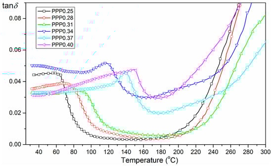 The results of temperature investigation of dielectric loss for PMN–PT–PS samples are presented in Figure 7. The measurements show very low values of tanδ(T) of the PMN–PT–PS samples. For all of the compositions, the increase in temperature from room temperature to Tm temperature causes a slight increase in the value of dielectric loss. The dielectric loss is reduced next just before the phase transition. Just above the Tm temperature, there is a temperature range in which the PMN–PT–PS solid solution shows the lowest values of dielectric loss. In case of the PPP0.25 composition, this area is the widest, while in the PPP0.40 composition, it is the narrowest. A further increase in temperature causes a rapid increase in dielectric loss associated with an increase in electrical conductivity of the ceramic materials. Similar results of dielectric tests are presented in Ref. [24]. The obtained results of temperature investigations of dielectric loss correlate well with the electrical conductivity measurements (Figure 4).