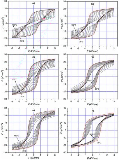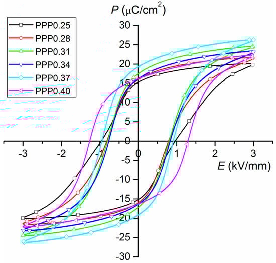 Compared to the unmodified PMN–PT materials presented in previous work [11] for PMN–PT–PS materials, the S-E loops are narrower (for samples with the same PT content, except for the PPP0.25 composition). Furthermore, the S-E loops obtained for PMN–PT–PS materials do not show a pronounced asymmetry, as in the case of the PMN-PT materials [11] and another one [28].